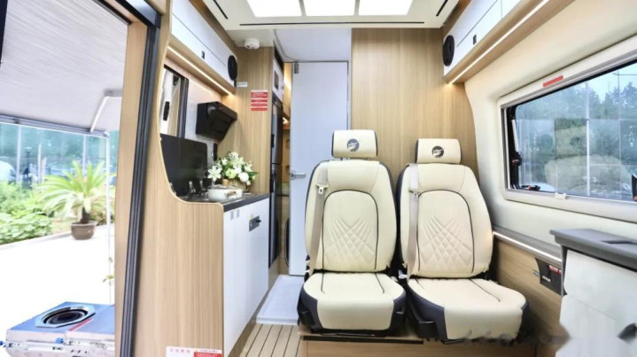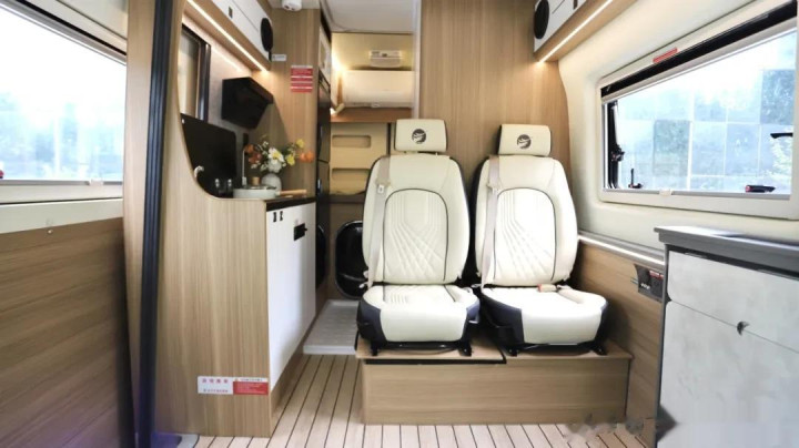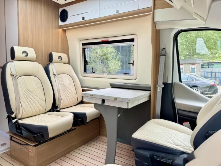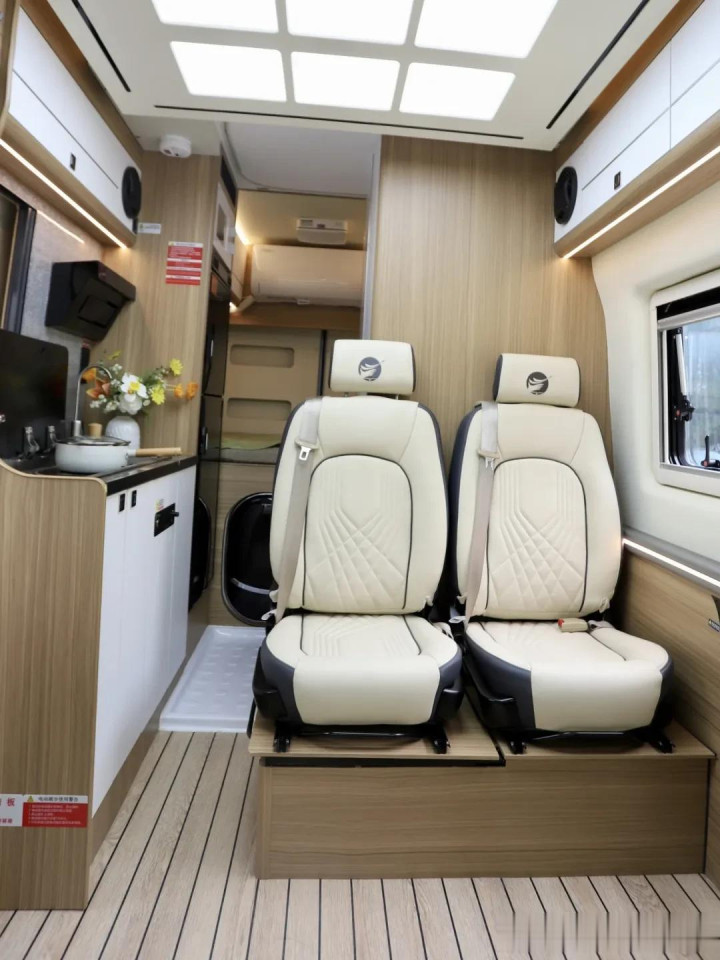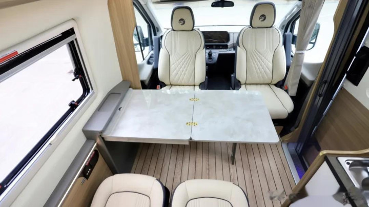 再看看这会客厅的空间,非常开阔。要知道,对于B型房车来说,由于尺寸限制,能拥有如此宽敞的会客厅,真的实属难得。在驻车状态下,主副驾驶能够进行180度旋转,瞬间就能营造出更宽阔的空间。中排为独立调节的汽车商务座椅;另外,有一个关键之处在于旁边的隐藏式桌子,在未使用时,所占空间不过几公分,当需要使用时,操作非常简单,仅需按下一个按钮,桌子便会升起。若两人使用,它是一个0.7米×0.53米的小吧台,多人使用时,桌子能够进行横向拓展,最大可达到1.2米的长度,供4-5人使用都绰绰有余,不管是家庭聚会还是朋友小聚,都能轻松容纳。
