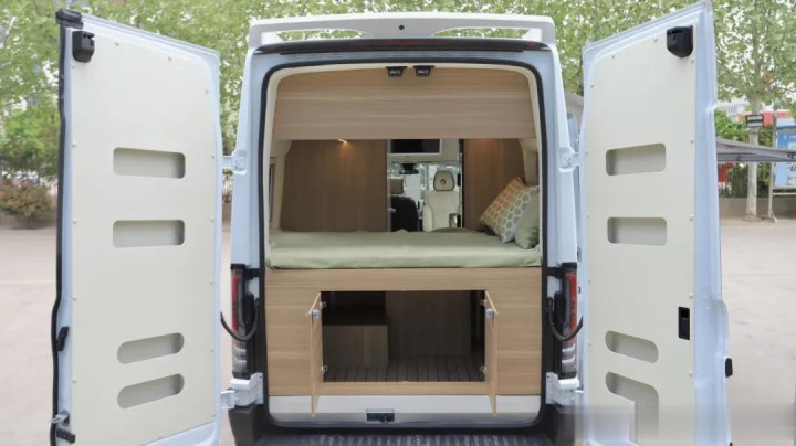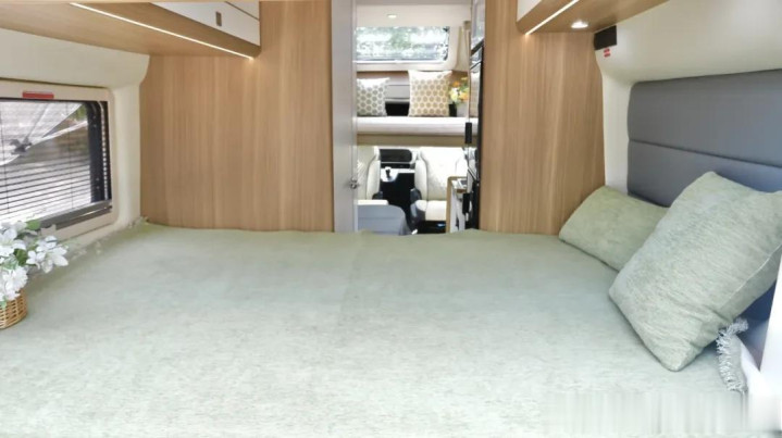 后方的横床处更是满满的细节,后横床借助了两侧的加宽护甲,长度做到2米,宽度做到1.3米,高个子的男士也可以轻松睡下了;床头床尾都设置了储物吊柜,日常出行的衣服被褥都可以放在里面,拿取也更加方便,床尾还有外推窗,不仅能进行通风换气,还能保证后床上的视野,以及家用空调也安装在了固定床的上方,可以对车内的温度进行调整,保证车内的温度始终适宜。