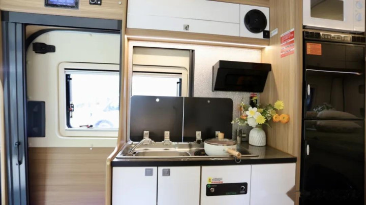 要想出门在外吃得好,房车的内置厨房是必不可少,在会客厅对面的位置就是室内的厨房,吧台区干净整洁,不用的时候还能当做临时的小吧台,盖板打开,洗菜池、内置的柴油炉,是高原版本具备5000W高火力值,在室内煎炒烹炸也能实现,上方还贴心的设置了强排抽油烟机,做饭产生的油烟直接就排到室外。上下都是储物空间,可以用来储存厨房物品;旁边是房车专用冰箱,150L的大容积,放一周的食物也比较轻松;上方安装了微波炉,增加生活的便捷,想做点简餐也是非常方便的。
