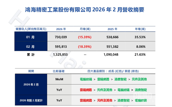 受春节假期影响,鸿海2月营收较1月的7300亿元新台币环比下滑18.39%。公司在公告中表示,四大产品线均受农历春节假期、工作天数减少影响,这一环比回落完全符合市场预期,属正常的季节性波动。从累计数据看,鸿海前两个月合并营收达1.3258万亿元新台币,同比增长21.63%(以美元计价年增约26.8%),同样创下历史同期新高。结构上,云端网络与元件及其他产品贡献主要增量,消费智能产品约略持平。