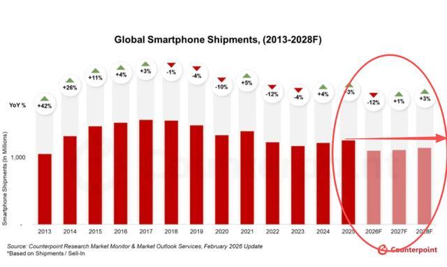 在这样的情况之下,手机销量不跌才怪了,所以2026年机构们预计是大跌12%,降至12亿台以下,并且由于存储芯片紧缺问题,在接下来几年时间都得不到缓解,所以接下来几年,智能手机都无法复苏,回不到2025年的高位了。